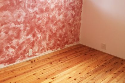 プラスター塗りは、石膏プラスターを「こて塗り」し、下地には、ラスボードとよばれる石膏を芯にして被覆成型しプラスターが付着しやすいように適当な間隔でくぼみをつけたボードが使用されます。石膏プラスターはモルタルに比べて硬化が速く、収縮が少なく、また比較的薄く塗ることができますが、耐水性は劣ります。通常は、屋内の間仕切り壁や天井に施工しています。